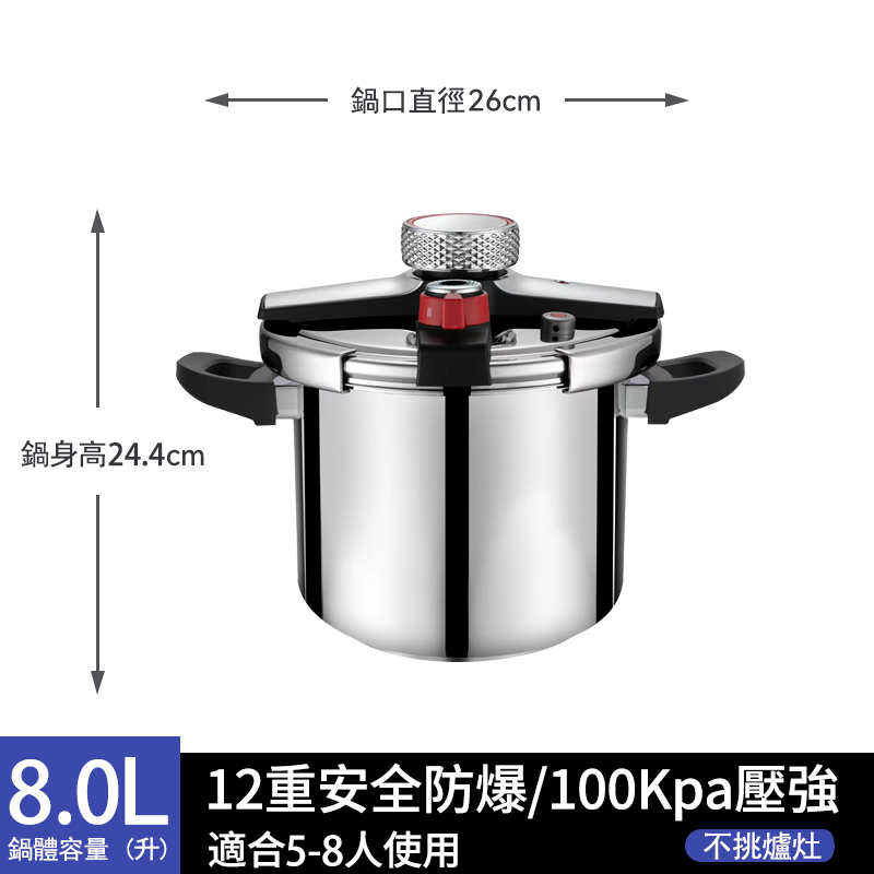 12分鐘前德國進口304不鏽鋼壓力鍋|燃氣電磁爐通用|安全升級限壓閥|燉肉煮飯熬粥一鍋搞定 - 升級加厚 8L【適合5-8人使用】304不鏽鋼壓力鍋 NT$3080