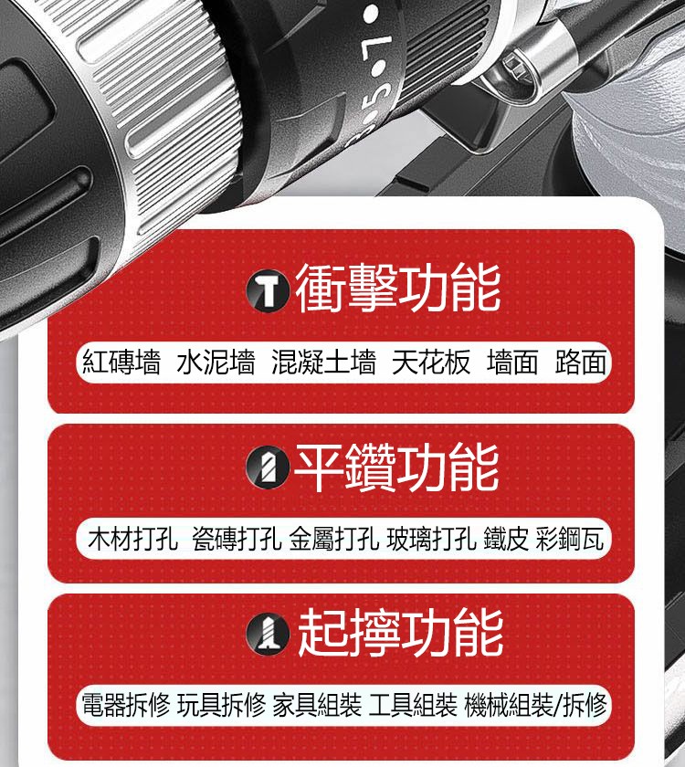 2分鐘前德國大功率 雙速衝擊鋰電鑽 純銅電機 無極變速 雙軸承設計 十年換新 - 進口衝擊15580VF塑箱2電+豪禮 NT$1980